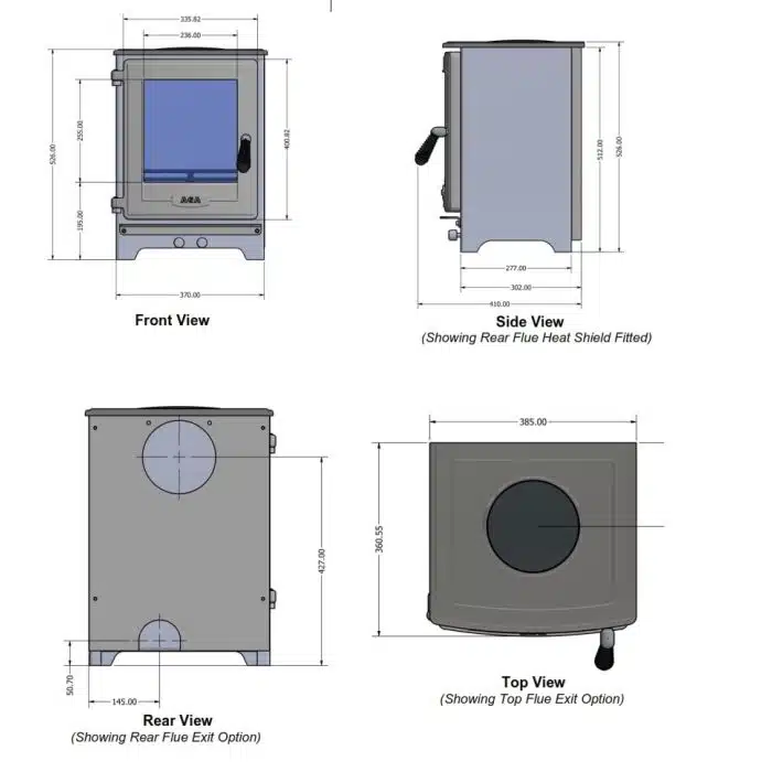 Specification: Manufacturer AGA Stoves Style Traditional Energy Label A+ Ecodesign Yes Fuel Multi-Fuel Dimensions 525mm (h) x 380mm (w) x 359mm (d) Kw Output 4.5 Defra Approved Yes Boiler Option None Material Steel Flue Diameter 125mm Flue Outlet Top or Rear Canopy N/A Finish Matt Black Efficiency (%) 80.6 Max Log Length (mm) 275