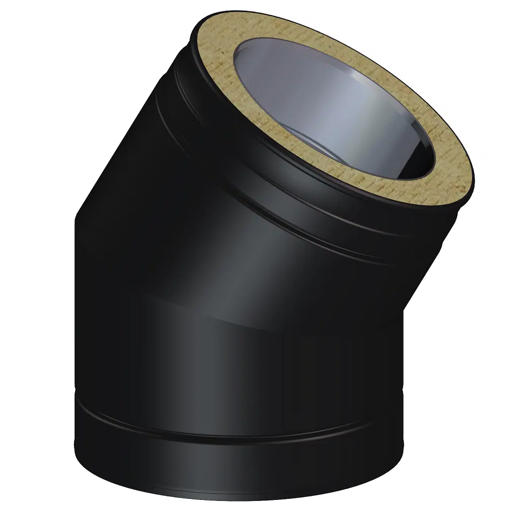 This 5″ (130mm) Black 30 Degree elbow is part of the Dinak DW Design System, which is a twin wall flue chimney system manufactured in Europe. Suitable for all types of applications: wood, pellets, gas, gas oil and condensing oil. This elbow is used to aid in the change of direction within a flue system.