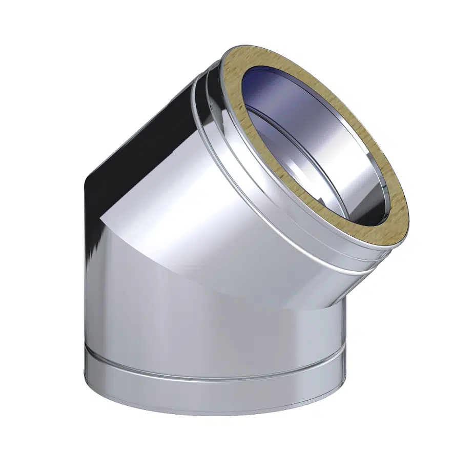 This Dinak DW Design 5″ (130mm) Stainless Steel 45 Degree Elbow Dinak DW Design System, which is a twin wall flue chimney system manufactured in Europe. Suitable for all types of applications: wood, pellets, gas, gas oil and condensing oil. This elbow is used to aid in the change of direction within a flue system.