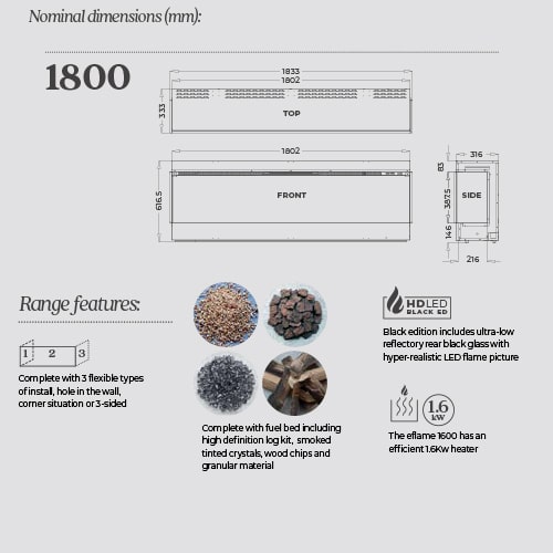 Alongside its stunning appearance, the eFlame 1800 includes an efficient 1.6kW thermostatic heater, providing comfortable and controllable heat when required, making it both a stylish feature and a practical heating solution.