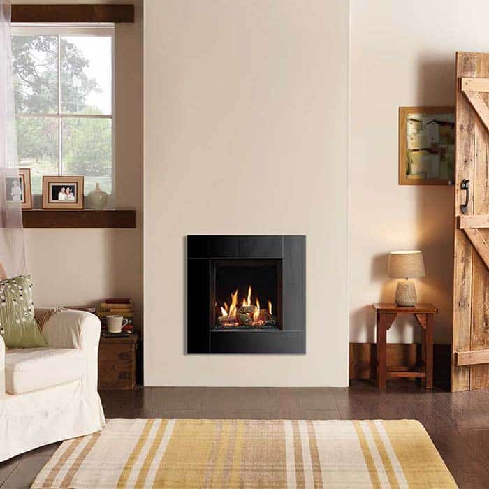 The Gazco Icon XS gas fire adds a black glass frame composed of four geometrically placed glass pieces. Amplifying the fire’s presence, this chic framing option makes a strikingly contemporary statement in any setting.