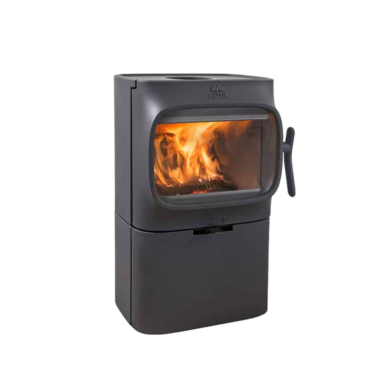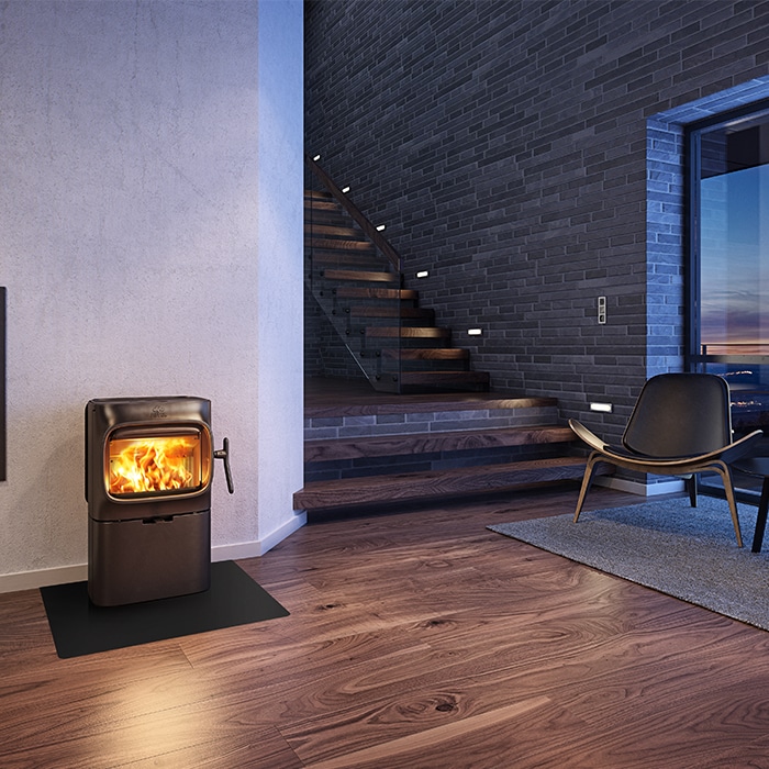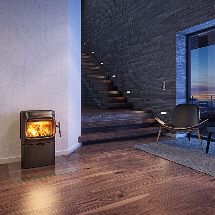 This Jøtul F105 is on a closed base which follows the shape of the stove down to the floor. The unbroken lines and smooth surface of the cast iron gives the clean design.