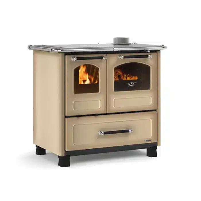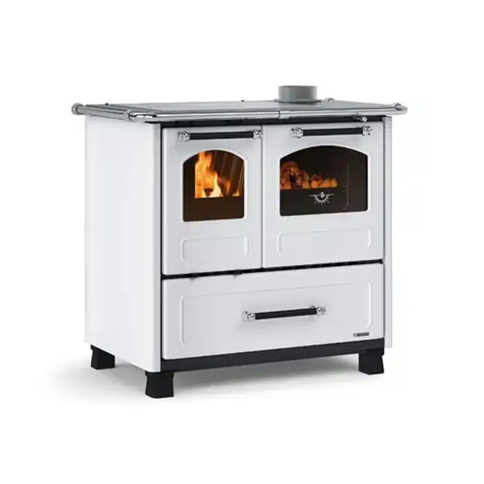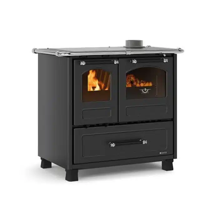 The La Nordica Family wood-burning cooker brings contemporary style and practical functionality to the modern home. With its sleek glazed steel exterior and clean, minimalist lines, it’s as attractive as it is efficient. At the heart of the design is a spacious 41-litre oven, paired with two glass-fronted doors that make cooking simple and convenient. The large cast iron cooktop features a single ring burner, ideal for preparing meals while enjoying the warmth of a real wood fire. Beneath the oven, a built-in wood drawer offers handy storage.