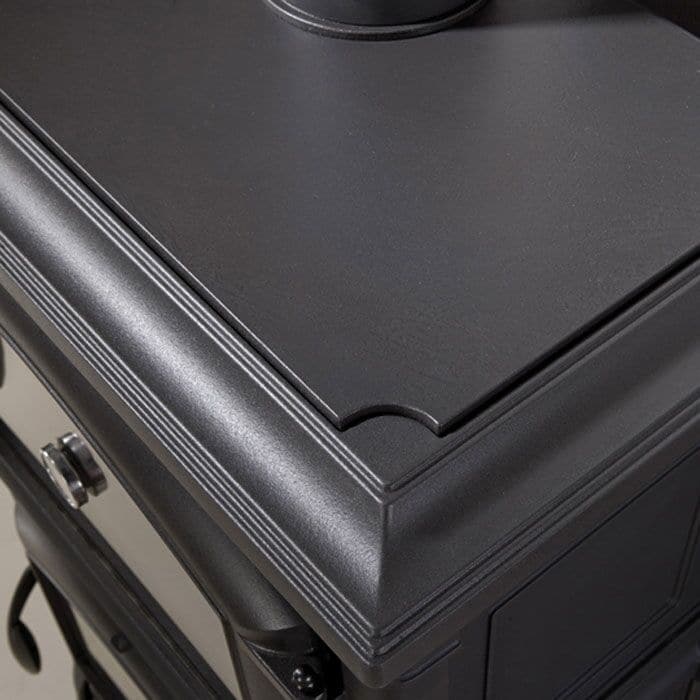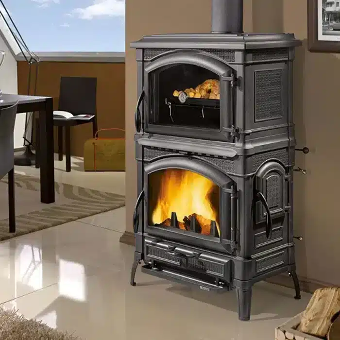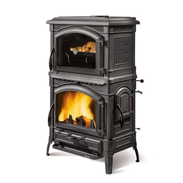 The La Nordica Isotta Forno Evo is a wood-burning stove that blends classic design with the durability and efficiency of high thermic yield cast iron. Built to meet Eco Design standards, it features a powerful post combustion system that helps reduce emissions while maximising heat output. With a nominal output of 9.7kW and a peak of 11kW, it delivers ample warmth for medium to large rooms. One of its standout features is the 39-litre enamelled oven, perfect for cooking while the stove is in use, adding both function and charm to your living space. The stove includes both front and side loading doors for flexible fuel access, a large viewing window to enjoy the fire, and a clean glass control system to help maintain a clear view. Finished with robust cast iron doors, the Isotta Forno Evo offers a perfect balance of tradition, performance, and practicality.