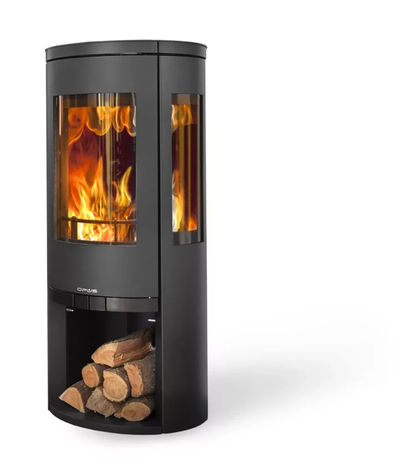 The Opus Trio LS presents a highly contemporary cylindrical wood-burning stove, offering a captivating view from all perspectives with its side glass viewing panels. Elevating its visual appeal, a chic log store positions the Opus Trio LS as a commanding focal point within your living area.