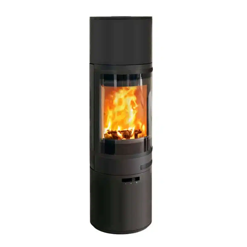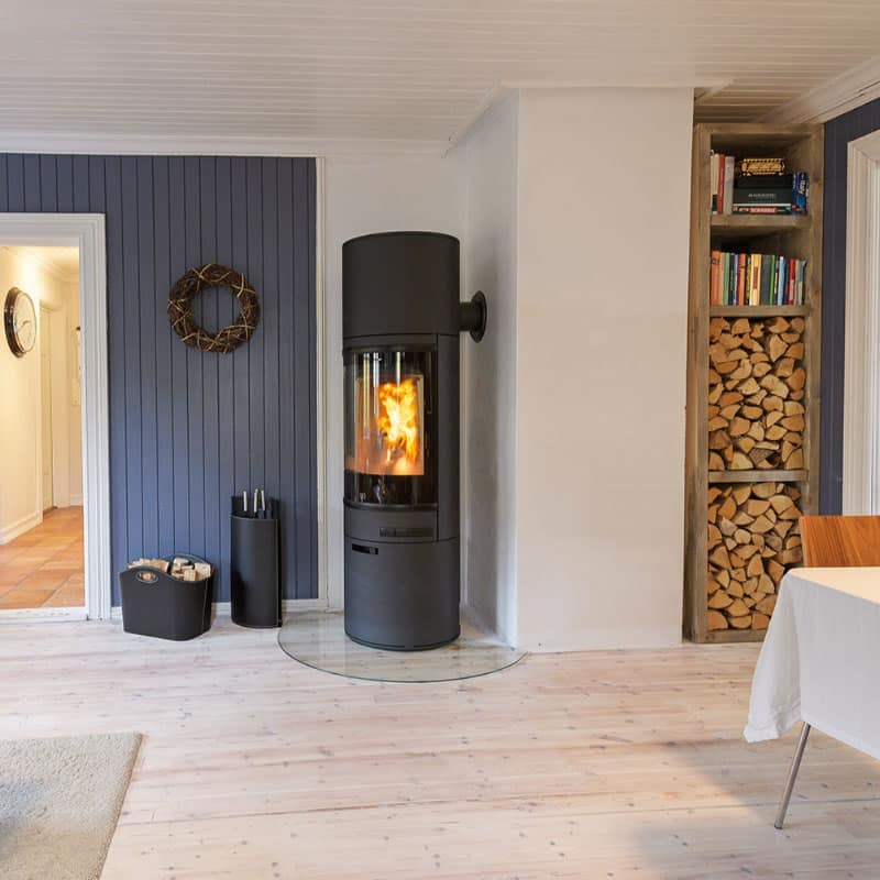 The Scan 85-3 Maxi is a large high base and high top cylindrical wood-burning stove which is perfectly suited for larger rooms with black trim and handles. Heat storing stones are a additional option for this stove providing heat for up to 12 hours after the last log has been placed. This stove has received the Red Dot Design Award.
