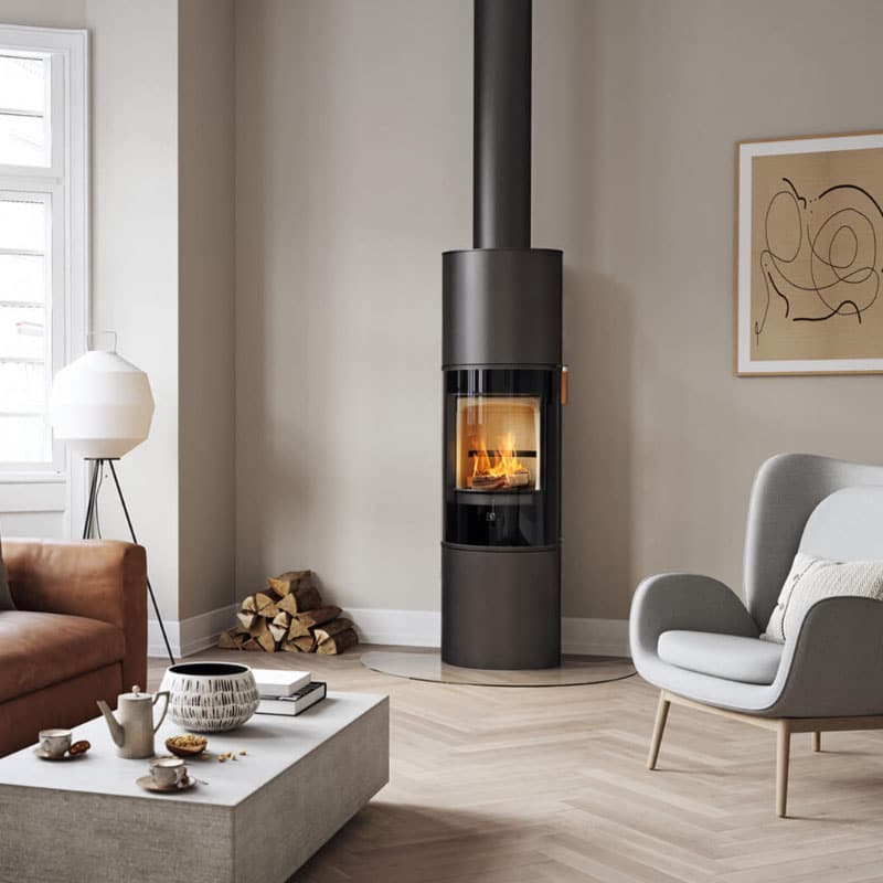 The series has several possibilities for additinal details to raise design and function one more level. The stove can be mounted on a rotating base, so you can rotate the whole stove and enjoy the fire from your favorite spot in the room. The tall variants in the seres, Scan 84-3 and 4 can be equipped with heat retaining stones hidden in the top. These provide extra heat for up to 12 hours after the last log has been placed.
