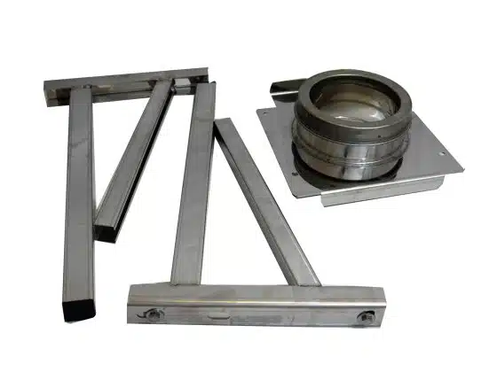Load-bearing support including top plate with 118mm pipe pre-fitted and side plates – 100mm to 350mm stand off – supplied with locking band. In stainless steel finish.