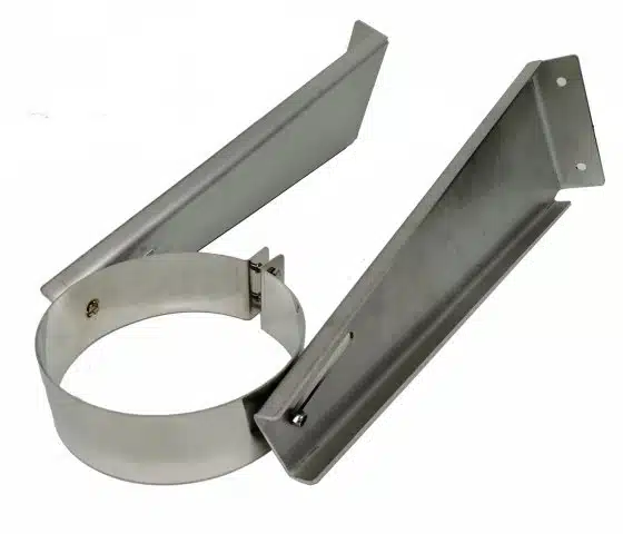 Band with triangular side plates providing 200-375mm stand off designed to minimise the footprint of the side plates whilst maximising the load bearing capability allowing for one support to be used on most standard bungalow or 2 storey homes supporting up to 10m of chimney. Suitable for either 90 or 135 degree tees and can be retrofitted over the top of the standard pipe section immediately above the tee.