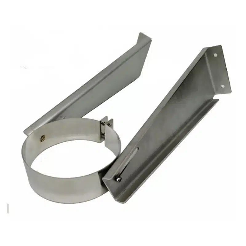 Band with triangular side plates providing 200-375mm stand off designed to minimise the footprint of the side plates whilst maximising the load bearing capability allowing for one support to be used on most standard bungalow or 2 storey homes supporting up to 10m of chimney. Suitable for either 90 or 135 degree tees and can be retrofitted over the top of the standard pipe section immediately above the tee.