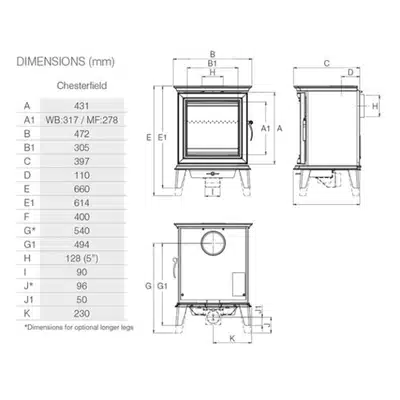 Moreover, thanks to their urban area approval, these advanced stoves are exempt from DEFRA Smoke Control Areas, meaning they are suitable for your home whether you live in the town or country. This multifuel stove is available in a wider format: the Chesterfield 5 multifuel Wide. Combining innovative combustion systems, superb flame visuals and timeless styling, the Chesterfield wood burning and multi-fuel range is the sum of over 38 years of British design and engineering.