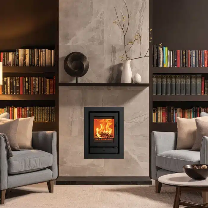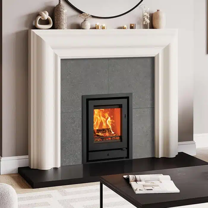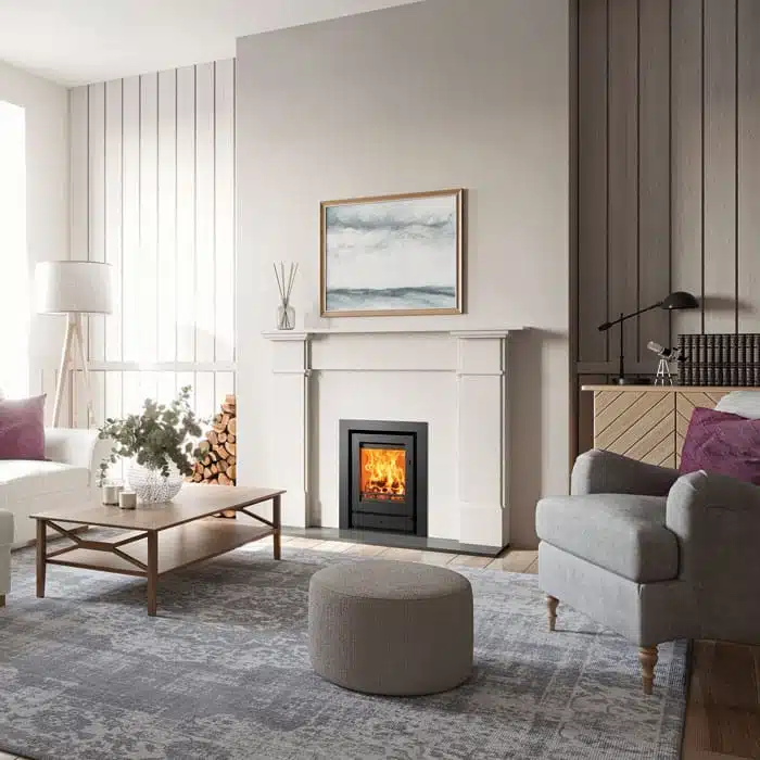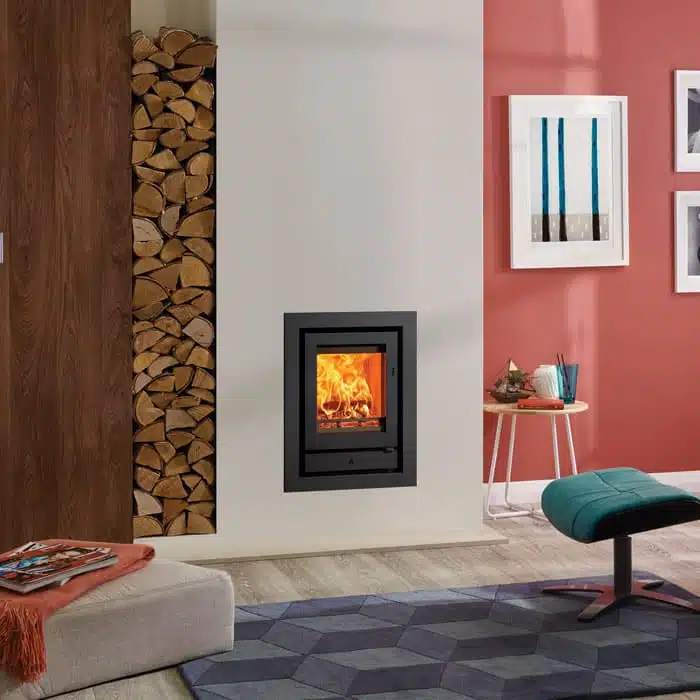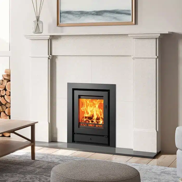 The Ecodesign Stovax Riva2 40 multi-fuel fire delivers sophisticated design and Ecodesign performance in equal measure. Designed specifically to fit into a standard 22” high x 16” wide British fireplace opening with the chairbrick removed. This allows you to install the fire into an existing opening with less building work, and in some cases even without removing a hearth and mantel already in place. With a high-quality steel exterior, cast iron grate and log guard, and geometric handle design, the Riva2 inset fire range offers both designer flair and high efficiency heat in four different sizes, to suit a range of installations. For a truly mesmerising centrepiece, all Riva2 fires can be selected with one of two decorative frames; the minimalist Profil XS or the slightly wider Profil frame. Both frames are available in either three-sided or four-sided versions, allowing you to hearth mount your Riva2, or elevate the fire’s position for a modern ‘hole-in-the-wall’ look.