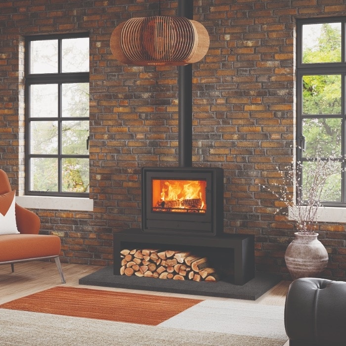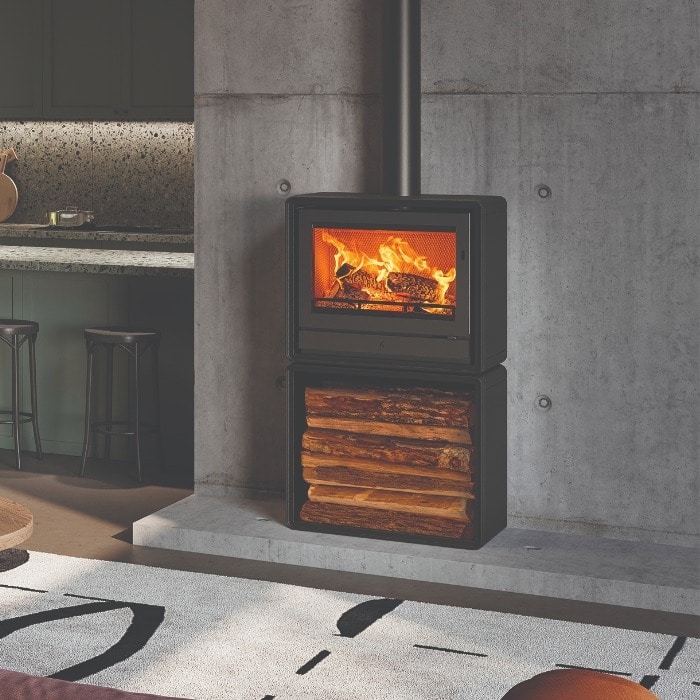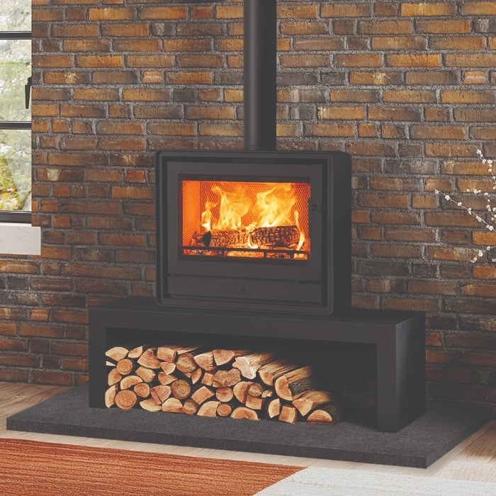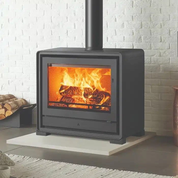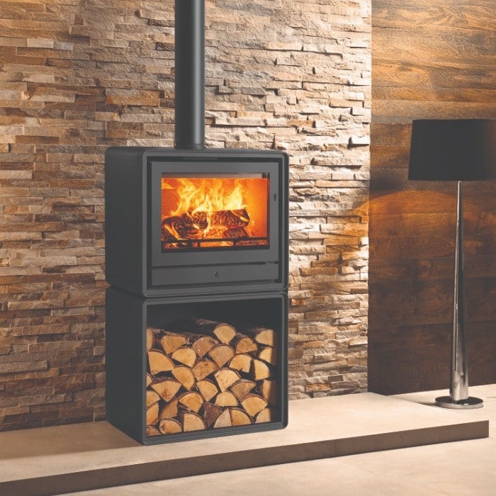 Style / Finish Options: Matt black finish standard; optional cast or wood-effect feet; optional log-store base; compatible with stove bench installation