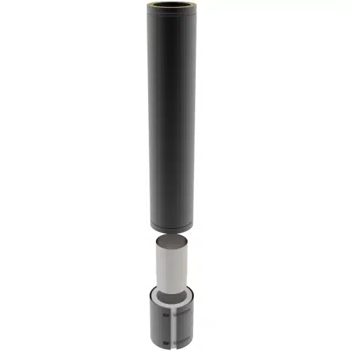 1000m pipe with an exposed telescopic connecting pipe built into the male end. This has a cover band and insulation to cover the connecting pipe. This can be used to connect directly on to a heating appliance and allows a clean streamlined finish to a stove installation. The disconnector section allows for easy removal of the appliance.