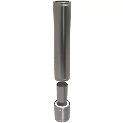500m pipe with an exposed telescopic connecting pipe built into the male end. This has a cover band and insulation to cover the connecting pipe. This can be used to connect directly on to a heating appliance and allows a clean streamlined finish to a stove installation. The disconnector section allows for easy removal of the appliance.