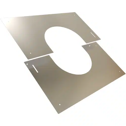 The Finishing Plate comes in two parts and is used to tidy the area around the flue as it passes through a non-combustible wall. This plate is attached to the wall where the flue is passing through between 45° and 60°. Use silicone and screws to secure against the wall..