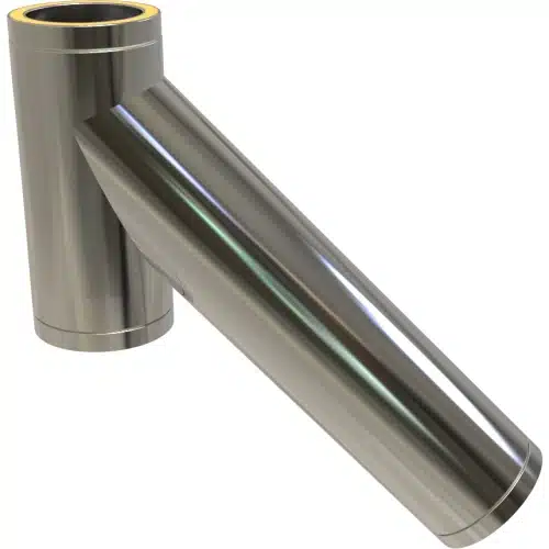 The Long 135° Tee is used when you need a cleaning access at the base of the chimney. It is the first piece installed on the external wall and allows for ease cleaning of the flue. The 135° Tee is shaped in such away that it does not restrict the flue gases, it has a extra-long branch that will reach through most standard UK wall constructions.